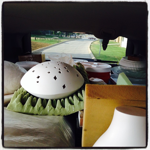 The trip from Columbia was the first time I’ve transported works in progress – leather hard green ware and even a few bone dry pieces.  I admit, it definitely lightened up my lead foot on the gas pedal, lol!