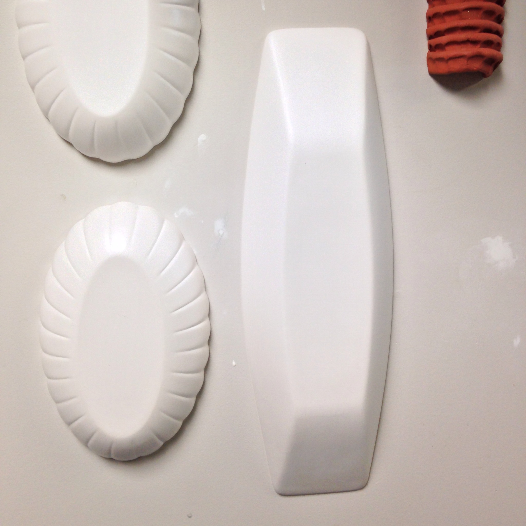 I managed to squeeze in a little work time in my own studio, and finally fired some of the new slipcast wall forms. I love this new elongated form, although of the three I fired, only one is a keeper. Time to get back to pouring slip!