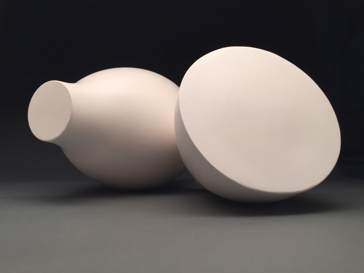 slipcast and assembled porcelain forms with burnished terra sigillata surfaces.
