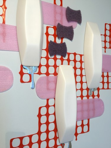 Ceramic objects, construction barrier, found objects. Cone 04 oxidation.